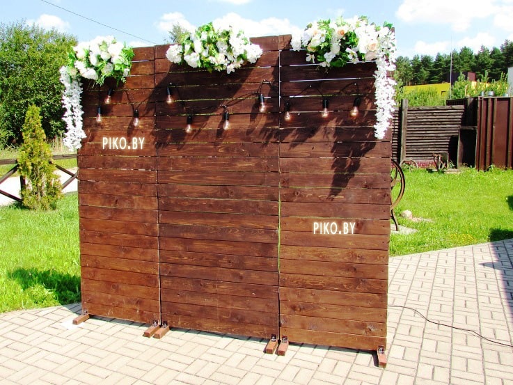 Подобный вариант декора ширмы из дерева используется и в помещении. Сам банкет проходит в зале кафе с элементами из дерева, декор свадьбы в котором наша команда оформителей выполняла ранее.