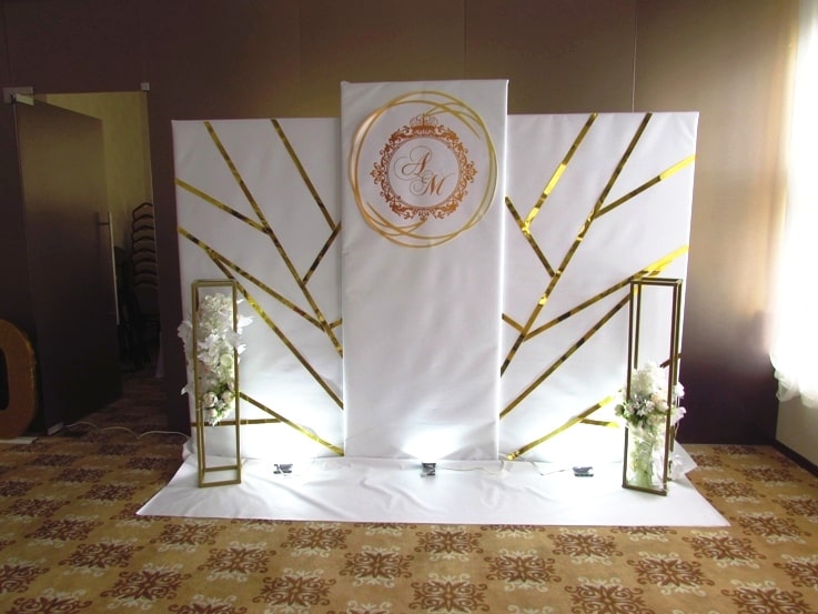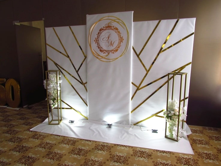 Эта фотозона с небольшими изменениями подойдет не только на праздник 50-летия, но и другие круглые даты и события: крестины, появление ребенка, детские дни рождения. Заказать украшение зоны для фото на свадьбу Вы можете в нашей студии праздников по разумной стоимости на услуги. Подобный вариант с небольшими изменениями подойдет и для декора свадьбы в Минске и области.