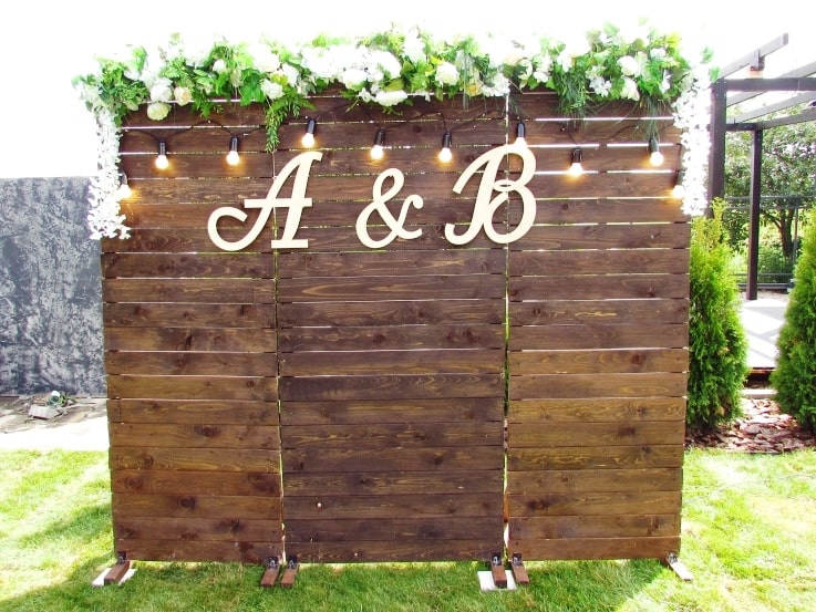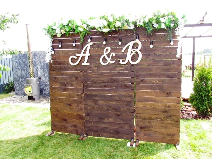 В вечернее время теплая подсветка внесла свой шарм в праздничную атмосферу, ведь рядом играла музыка, проходили танцы и развлечения. Этот вариант прекрасно подойдет для задника за молодыми на свадебном банкете.