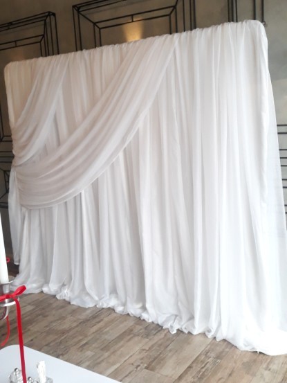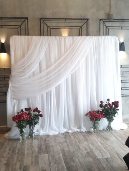 Конструкция для фотозоны с белой тканью даёт широкий простор для дальнейшего декорирования.