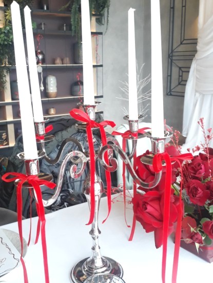 Общий гостевой стол оформлен подсвечниками с красными ленточками и композициями из нежнейших цветочков.