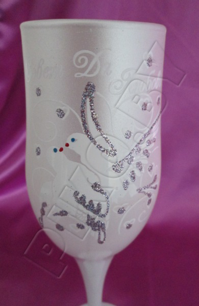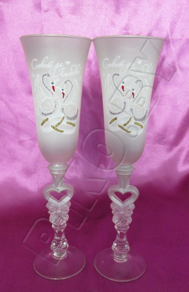 Оригинальные белые декорированные свадебные бокалы на фото покорят молодоженов и их гостей своим изяществом и красотой. Традиционно белый цвет является олицетворением свадьбы, чистоты, нежности, невинности. Такие бокалы можно смело декорировать воздушным кружевом, бисером, цветочным обрамлением, свадебным орнаментом, надписями, дополнять контрастными подставками. Отлично сочетаются с любой сервировкой, оформлением зала.