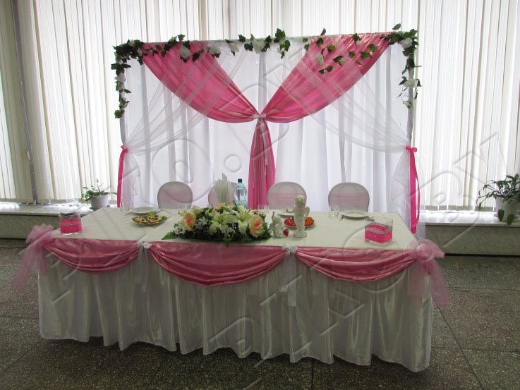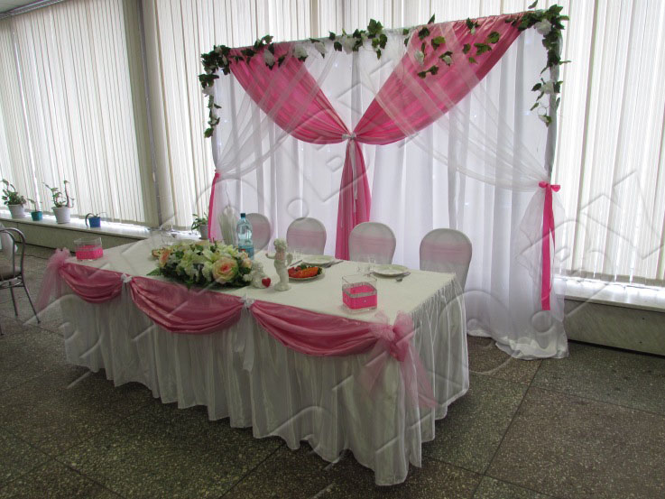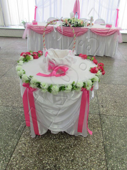 Украшение свадебного зала было выполнено в бело-розовом цвете. Декор включал: ширму за молодыми с подсветкой, оформление стола молодых с ангелочками, цветочной композицией и декоративными вазочками. Также был оформлен столик для дарения. Точную стоимость украшения зала на свадьбу можно узнать на сайте или по телефону.