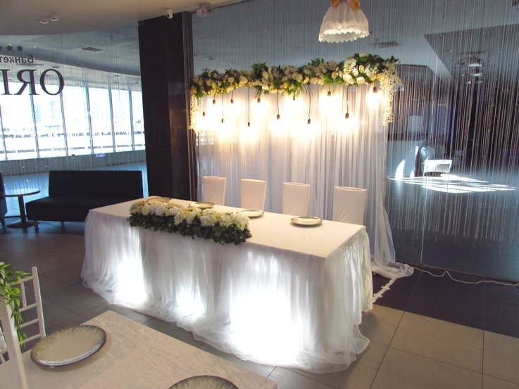 Для украшения зала на свадьбу была выбрана классическая зона молодых в белом цвете. Декоративные пышные цветочные композиции, два вида подсветки, чехлы для стульев – дополнили картину и придали президиуму праздничный вид.