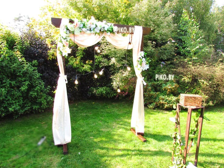 Для торжественной церемонии молодожены выбрали арку из дерева с цветочными композициями, атласной тканью и подсветкой в стиле ретро, что позволило добиться потрясающих фотографий в вечернее время.