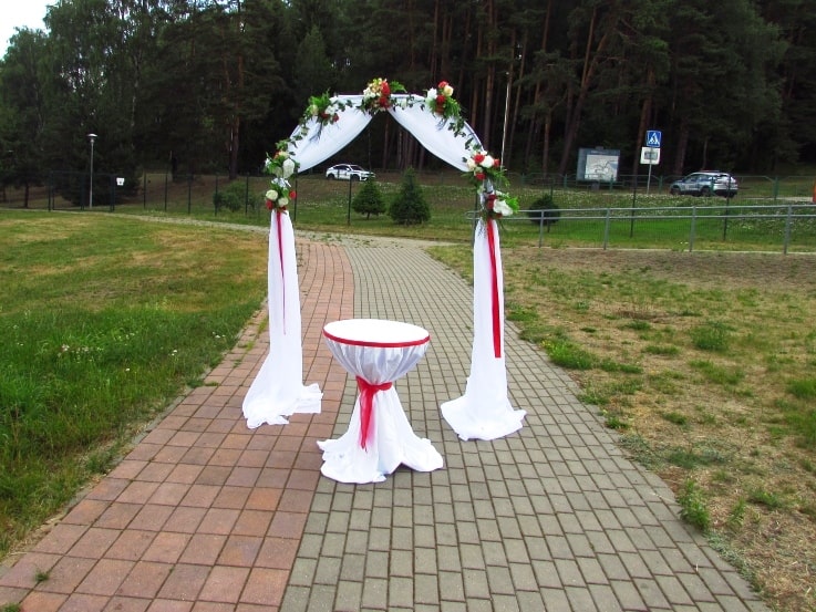 Площадка для проведения церемонии бракосочетания находится на заднем дворике ресторана «Оазис», принимающего гостей вблизи СОК «Раубичи». В банкетном зале заведения наши декоратора украшали президиум молодых с ширмой для другой пары.